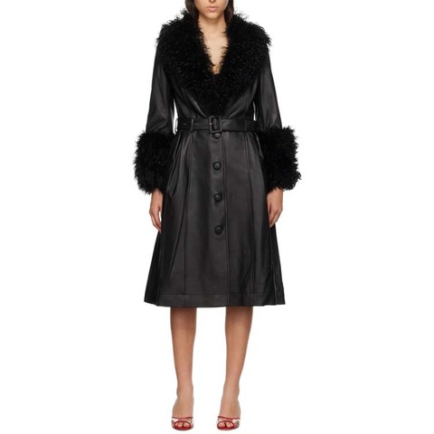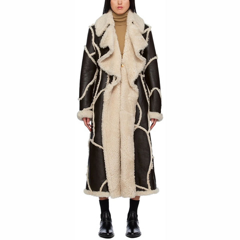 Black & Brown Long Shearling Coat Luxury Oem Custom Fur Jacket Comfortable WarmGrained Leather Coat Women Outwear 2023