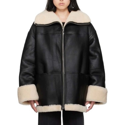 Black Signature Shearling Jacket Luxury Oem Custom Fur Jacket Comfortable Heavyweight Grained Lambskin Jacket